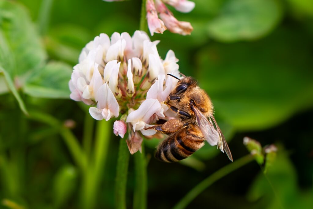 ミツバチは花から花へ移動する際、花粉を運ぶ役割を担っています。